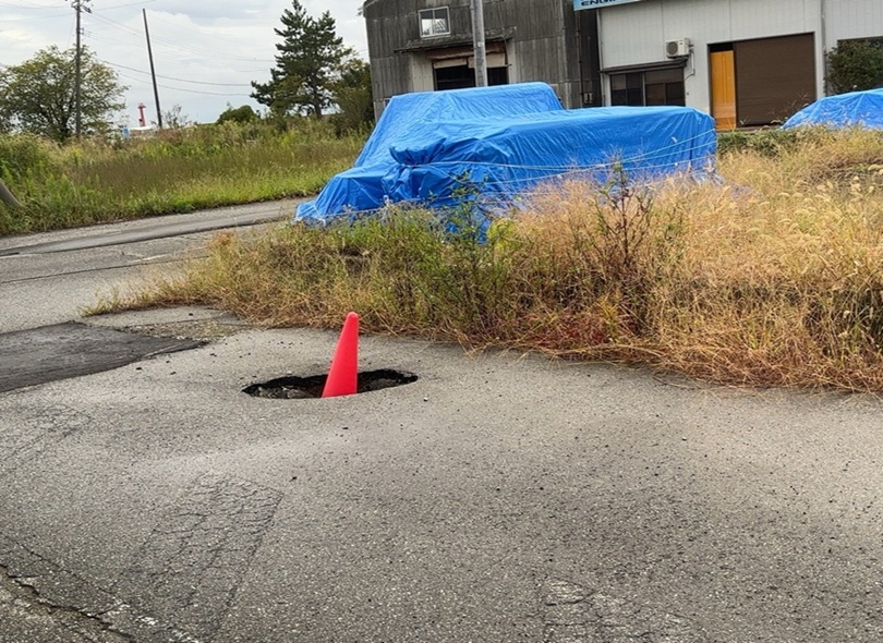 道路が一部陥没し、修復がまだできていないところ