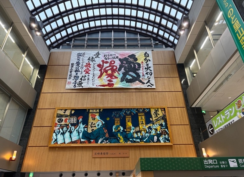 のと里山空港の2階にて。能登高校の書道部の作品が飾られている